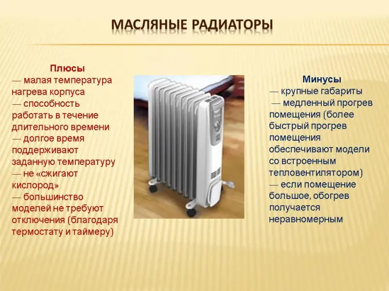 Минусы: у самых дешевых моделей присутствует эффект «сжигания кислорода» (на разогретую поверхность попадают частицы пыли, которые, сгорая, дают неприятный запах)