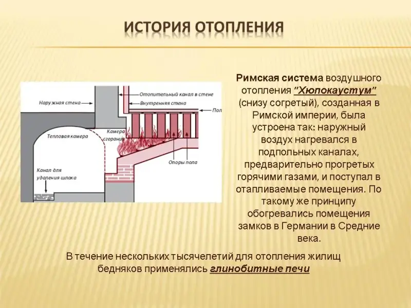 В Древнем мире самый простой и древний способ отопления путем сжигания топлива внутри помещения соседствовал с центральными установками водяного и воздушного отопления. Римская система воздушного отопления "Хюпокаустум" (снизу согретый), созданная в Римской империи, была устроена так: наружный воздух нагревался в подпольных каналах, предварительно прогретых горячими газами, и поступал в отапливаемые помещения. По такому же принципу обогревались помещения замков в Германии в Средние века. (слайд 3).