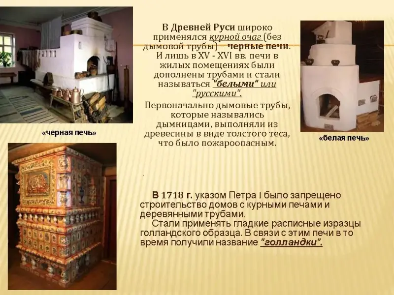 - В чем отличие печей, топившихся "по черному" и "белых"? Кто и когда запретил строительство в столице России "курных" ("черных") печей?