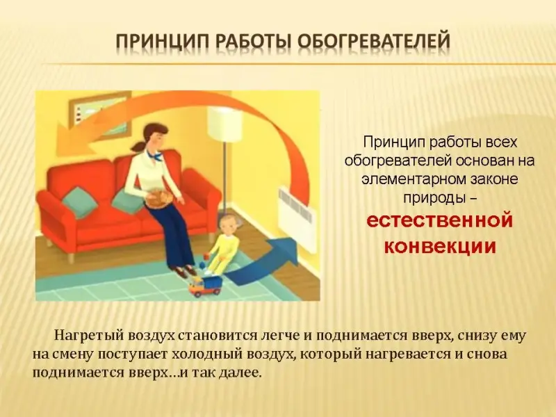 Принцип работы всех обогревателей основан на элементарном законе природы - естественной конвекции. Термин «конвекция» отражает принцип распределения горячего воздуха в помещении. Нагревательный элемент (спираль или решетка) нагревается электрическим током и передает тепло воздуху в помещении. Нагретый воздух становится легче и поднимается вверх, снизу ему на смену поступает холодный воздух, который нагревается и снова поднимается вверх…и так далее. (слайд 8)