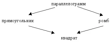 В форме фронтальной беседы с помощью наводящих вопросов учителя учащиеся проговаривают определения и свойства прямоугольника, ромба и квадрата, разделяя их на присущие всем одновременно и каждому в отдельности. Устная работа ведется с опорой на следующую схему