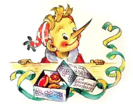 На доске лоты - портреты сказочных человечков: Буратино, Чиполлино, Мальвина.