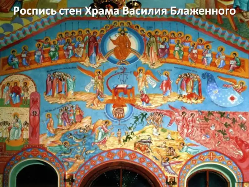 з) Православные храмы очень красивы. Полюбуемся интерьерами наших знаменитых храмов. Замечательны внутреннее убранство храма Спаса-на-Крови в Санкт-Петербурге, внутренняя роспись купола храма Христа Спасителя (в самом центре изображена Святая троица), роспись стен храма Василия Блаженного (слайды 23-25).