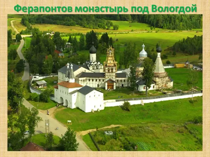 г) Монастыри на Руси играли роль центров духовной культуры и просвещения: в них создавались летописи, иконы, переписывались книги. В каждом монастыре обязательно есть храм. Сегодня монастырей не так много, как раньше, но многие из сохранившихся являются поистине жемчужинами архитектуры, например, Ферапонтов монастырь в Вологодской области (слайд 29).