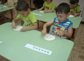 - раздаточный материал: на каждого ребенка карточки для счета, по одной геометрической фигуре, одному предмету, тарелочки с манной крупой.