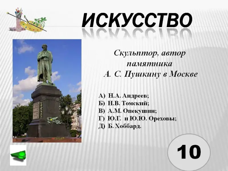 2. Скульптор, автор памятника А. С. Пушкину в Москве.