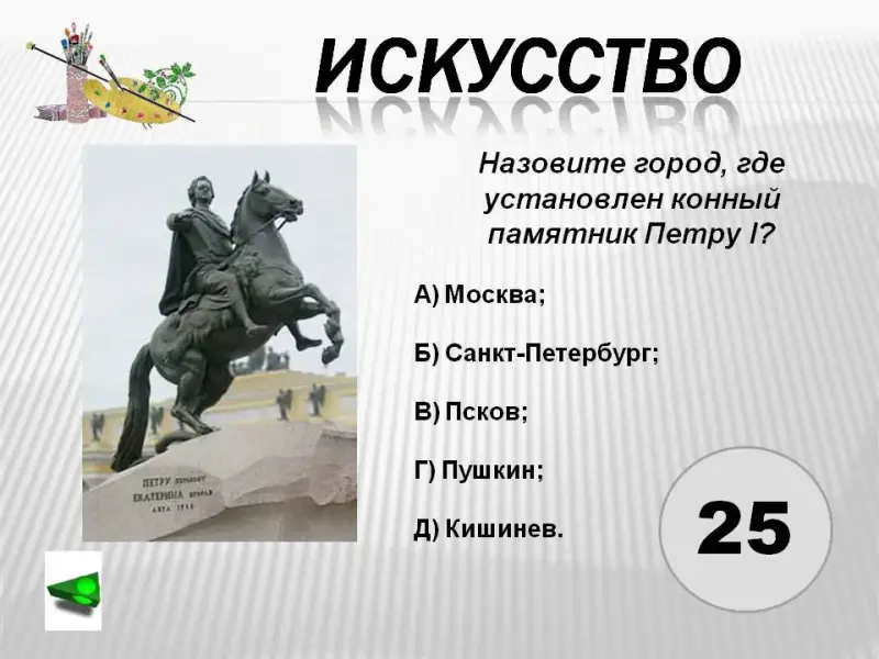 5. Назовите город, где установлен конный памятник Петру I?
