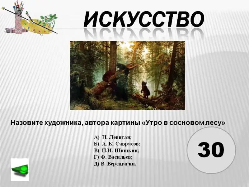 6. Назовите художника, автора картины «Утро в сосновом лесу».