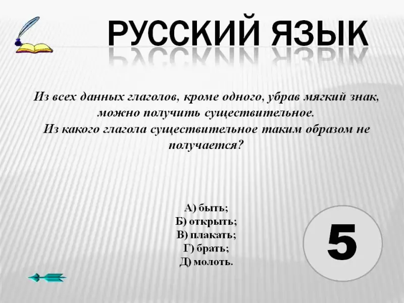 1. Из всех данных глаголов, кроме одного, убрав мягкий знак, можно получить существительное. Из какого глагола существительное таким образом не получается?