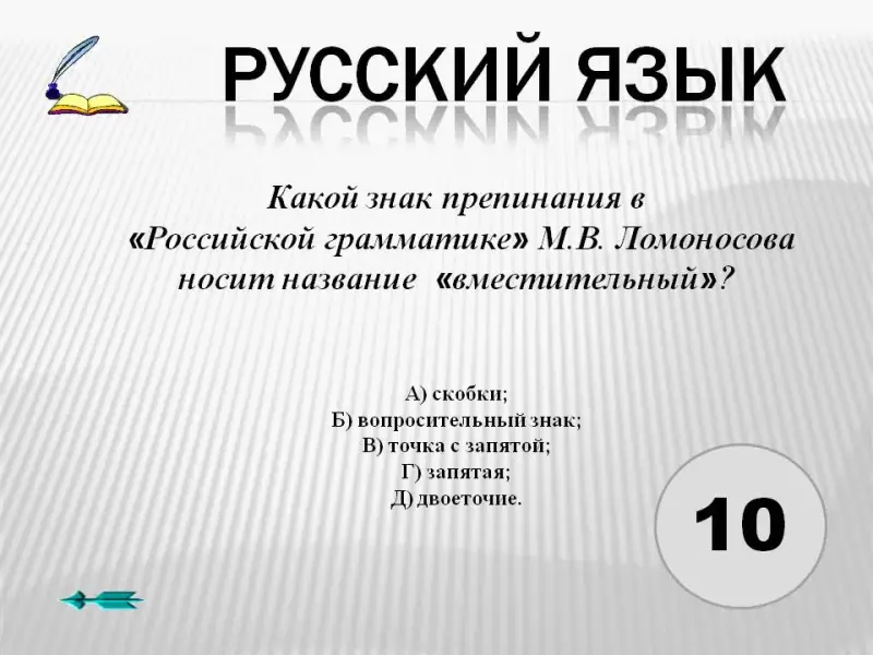 2. Какой знак препинания в «Российской грамматике» М.В. Ломоносова носит название «вместительный»?