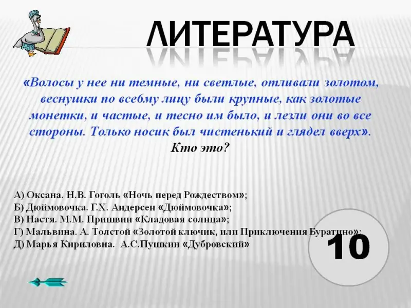 2. «Волосы у нее ни темные, ни светлые, отливали золотом, веснушки по все6му лицу были крупные, как золотые монетки, и частые, и тесно им было, и лезли они во все стороны. Только носик был чистенький и глядел вверх». Кто это?