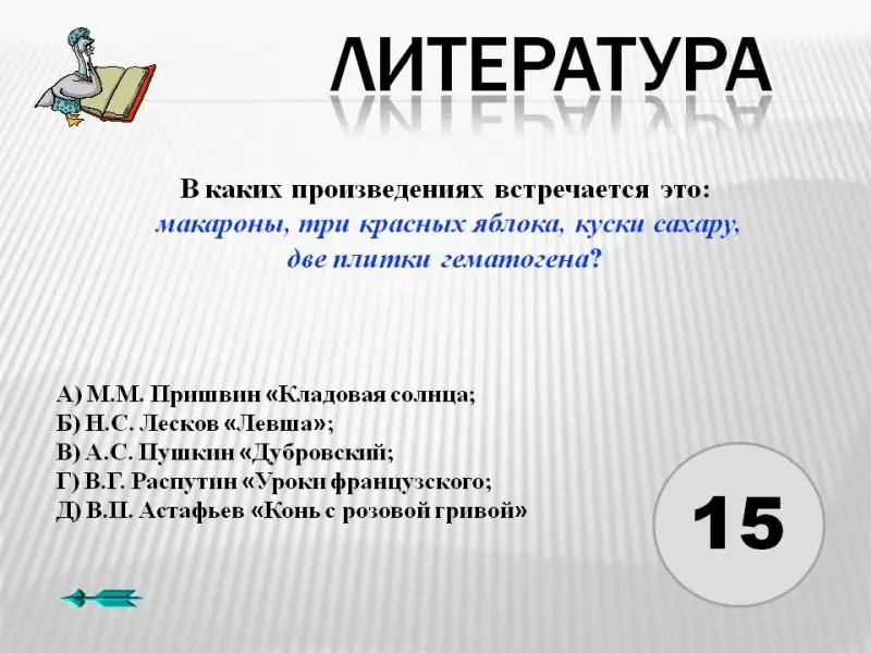 3. В каких произведениях встречается это: макароны, три красных яблока, куски сахару, две плитки гематогена?
