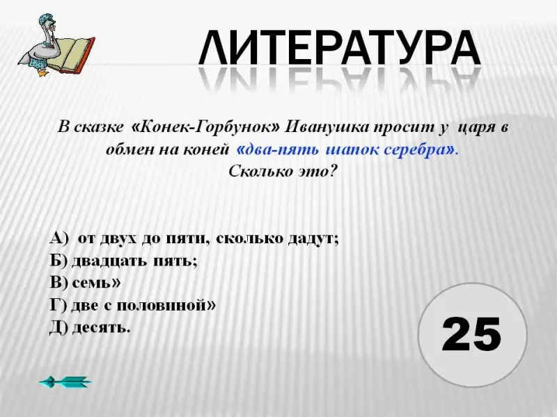 5. В сказке «Конек-Горбунок» Иванушка просит у царя в обмен на коней «два-пять шапок серебра». Сколько это?