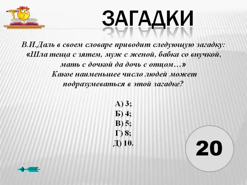 4. В.И.Даль в своем словаре приводит следующую загадку: «Шла теща с зятем, муж с женой, бабка со внучкой, мать с дочкой да дочь с отцом…» Какое наименьшее число людей может подразумеваться в этой загадке?