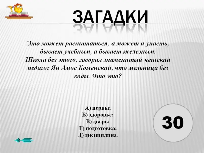 6. Это может расшататься, а может и упасть, бывает учебным, а бывает железным. Школа без этого, говорил знаменитый чешский педагог Ян Амос Коменский, что мельница без воды. Что это?