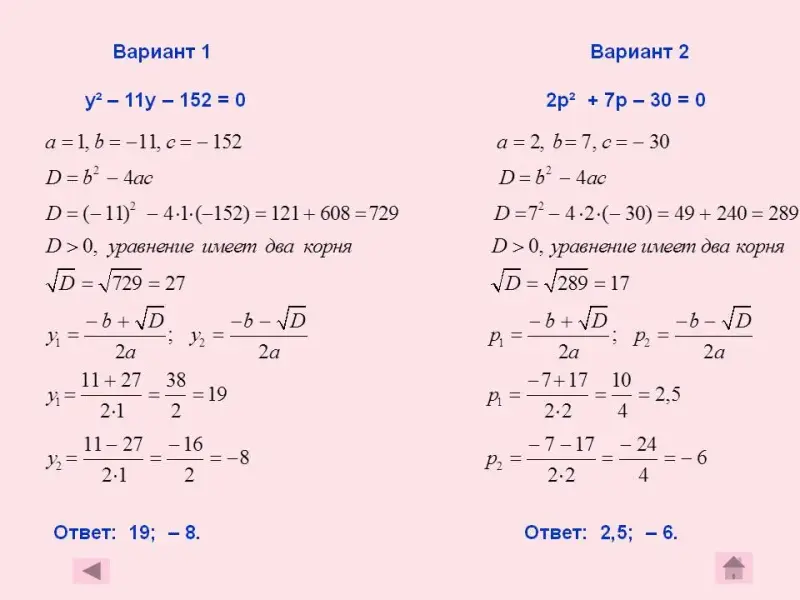 - составить алгоритм решения квадратных уравнений по формулам;