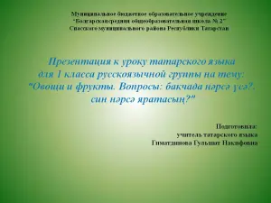 Данный урок татарского языка, рассчитанный для первого класса русскоязычной группы, является четвертым в теме “Овощи и фрукты”.