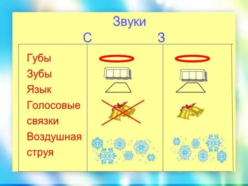 Голосовые связки не работают, звук глухой. - Когда мы произносим звук "З" наши губы улыбаются, зубы сближены, кончик языка находится за нижними зубами. Воздушная струя плавная, холодная, направлена вниз. Голосовые связки работают, звук звонкий. - Когда мы произносим звуки "С-З" наши губы улыбаются, зубы сближены, кончик языка упирается в нижние зубки, воздушная струя плавная, холодная, направлена вниз. - Отличаются тем, что когда мы произносим звук "С" голосовые связки не работают, а когда мы произносим звук "З" - работают. |