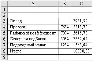 Пример1. Вы хотите зарабатывать 10 000 рублей в месяц, но не знаете точно, какой должен быть Ваш оклад, чтобы достичь этой цели. Примерно Вам известно как рассчитывается заработная плата, и прежде чем идти к начальнику по поводу увеличения жалования, хотите определить свою ставку.
