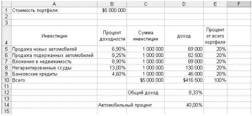 - Ссуды на автомобили должны составлять 15% от полной суммы портфеля. Это ограничение записывается так: D14=0,15