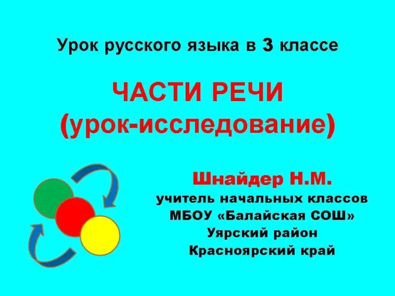 Оборудование: компьютерная презентация, для каждой группы: наборы цветных карточек (жёлтая, красная, зелёная и синяя), карточки с текстами (по 5 штук для каждой группы), карточки с текстами для проверки, фломастеры трёх цветов, справочный материал (таблица "Части речи"), итоговые листы, рефлексивные листы.