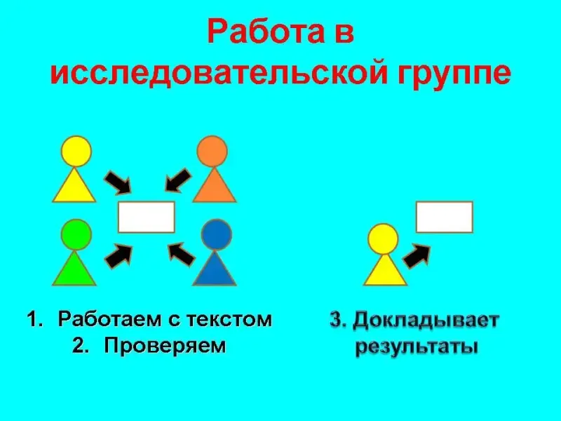 - Иногда учёные работают в одиночку, изучая интересующие их вопросы, но часто исследование совершают группы учёных. Мы сегодня тоже будем работать в таких исследовательских группах. Вы сидите в группах по 4 человека. У вас на партах лежат цветные прямоугольники (жёлтый, красный, синий и зелёный). Пусть каждый из вас возьмёт себе по одному. Теперь посмотрим, какая роль вам досталась. Слайд 5.