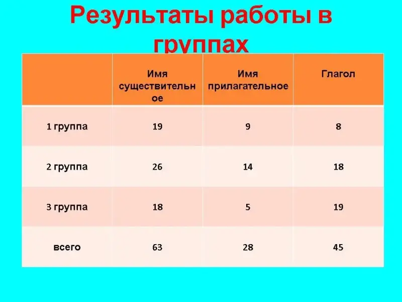 - А теперь проверим, насколько правильно справились со своим исследованием все группы. Слайд 8. Сравните свои числа с числами в таблице. Есть ли ошибки? Если есть, то внимательно посмотрите, слова какой части речи вы подсчитали неправильно, найдите ошибку, если она есть.