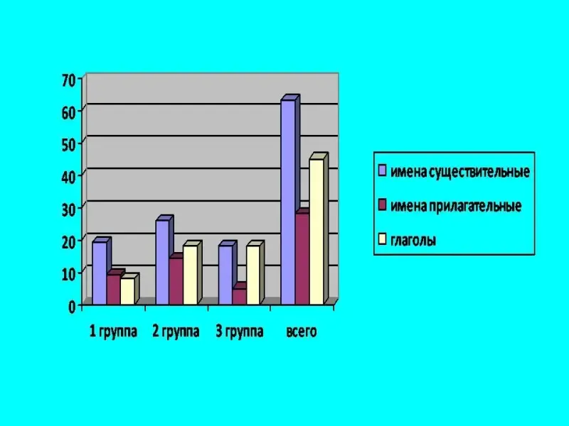 - Посмотрим на последнюю группу столбцов нашей диаграммы. Какой вывод мы можем сделать? В наших текстах самое большое количество имён существительных, меньше глаголов, а прилагательных ещё меньше.
