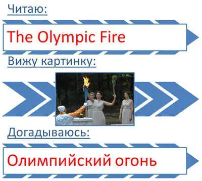 И, тем не менее, в ходе урока у второклассников неоднократно имел место феномен "языковой догадки". Прочитав интернациональное слово "Olympic" и затем, увидев изображение факела, дети догадывались, что предлагаемое словосочетание "TheOlympicFire" обозначает "Олимпийский огонь"; Прочитав "TheOlympicMedals" и увидев последующие три слова, детям легко было догадаться, что "golden" - это золотая, "silver" - серебряная, а "bronze" - бронзовая медаль.