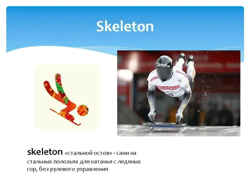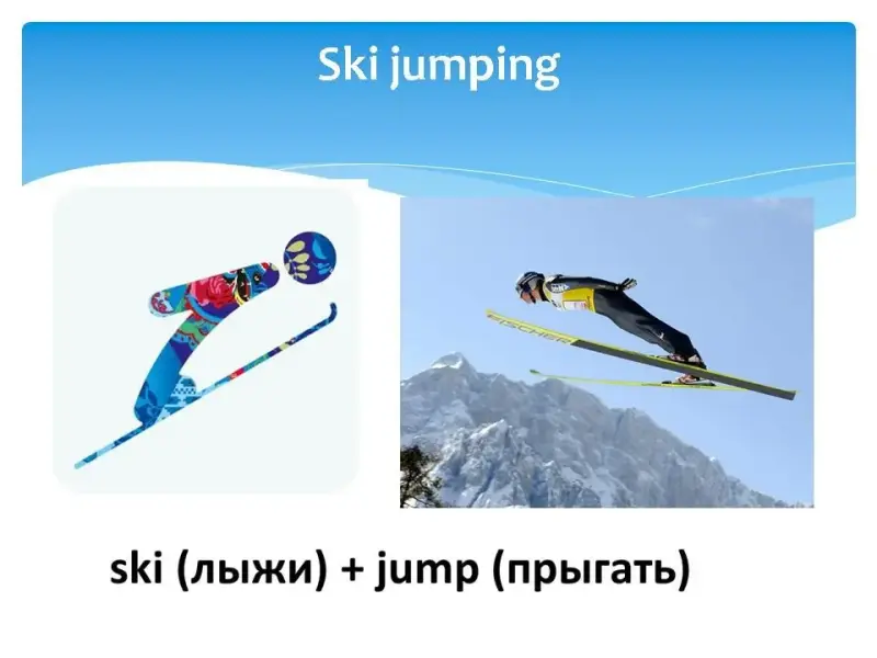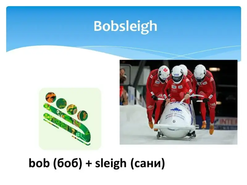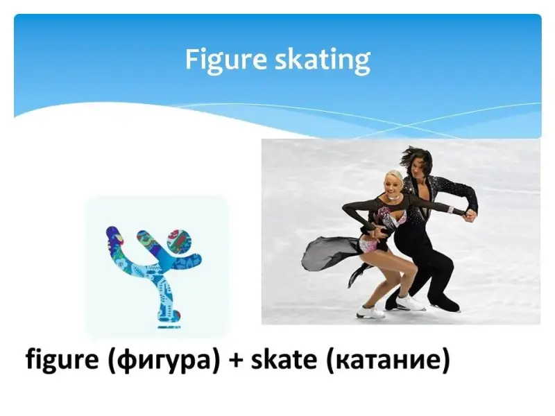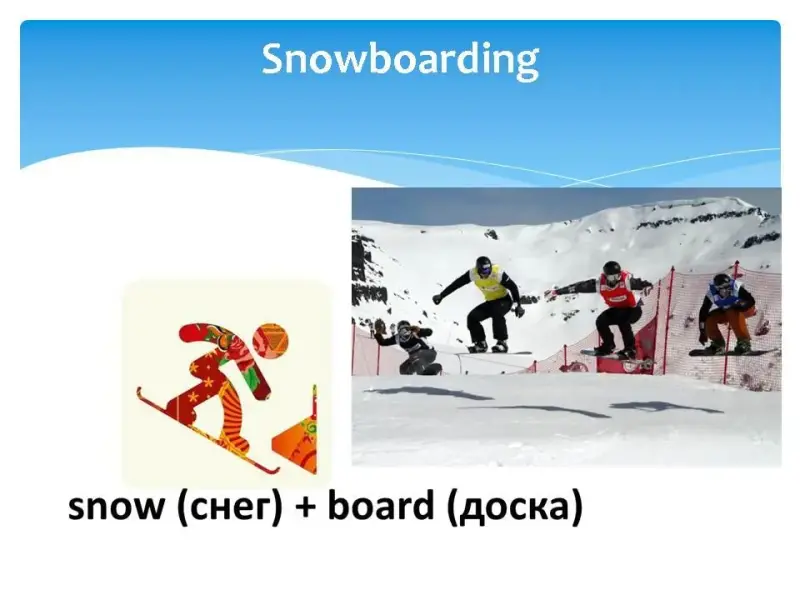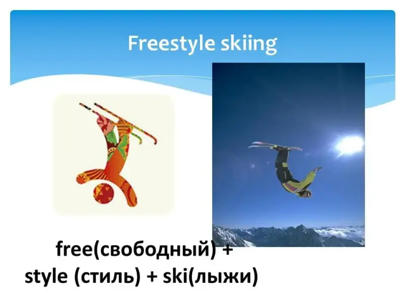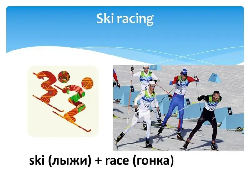 На экране последовательно появлялось название одного из зимних видов спорта, затем пиктограмма этого вида спорта, затем картинка, и только потом перевод на русский язык с объяснением.