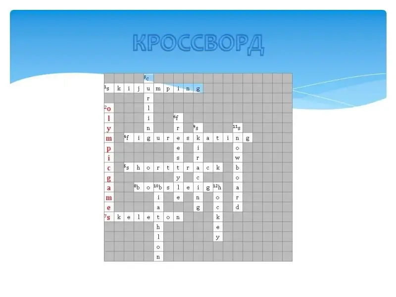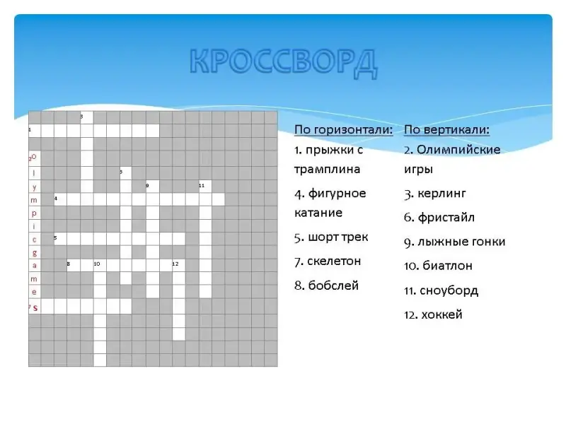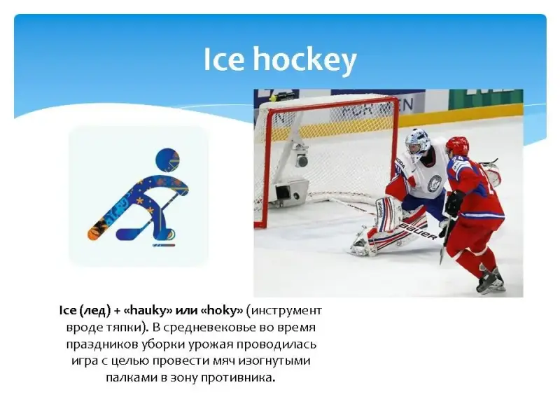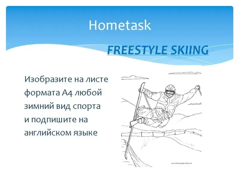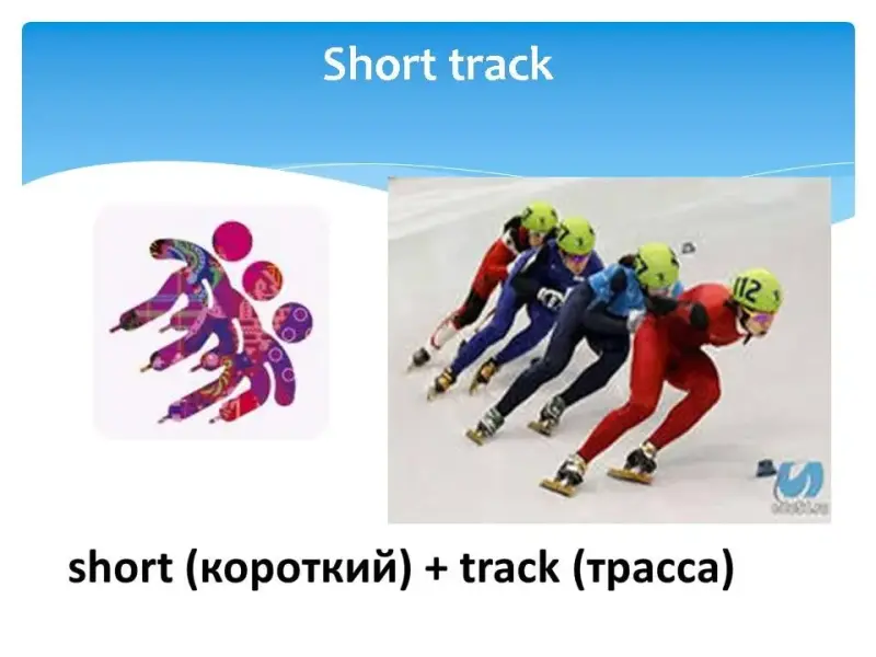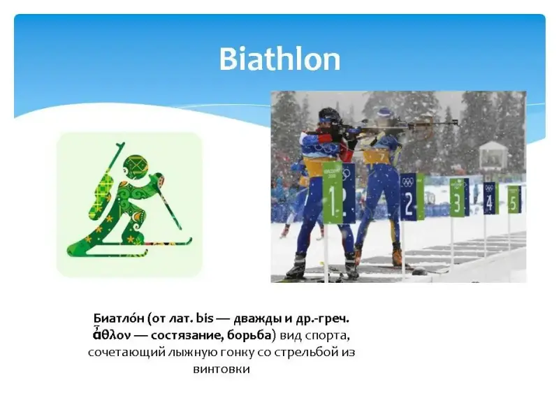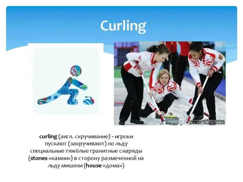 На экране последовательно появлялось название одного из зимних видов спорта, затем пиктограмма этого вида спорта, затем картинка, и только потом перевод на русский язык с объяснением.