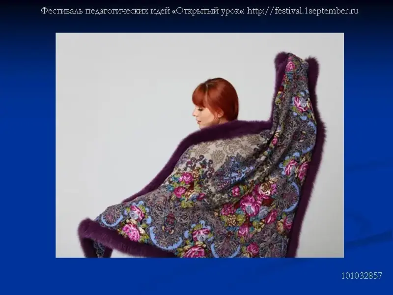 Раньше многие женщины носили платки на голове (Слайд 3), на плечах, иногда даже сложенными на руке, как украшение. Павловопосадские платки очень нарядные. Платки на голове или плечах придают женщине красоту, величавость, служат защитой от холода, сохраняя тепло и здоровье. Узорные платки и шали носили и в городах, и в деревнях. Красовались в них и молоденькие девушки, и почтенные матери семейства. Платок на Руси был самым желанным подарком. (Слайд 4-6)