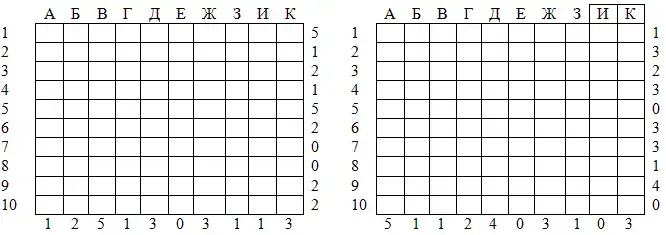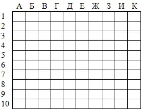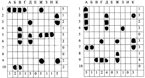 Реквизит: набор чистых карточек, закрывающих игровое поле, уменьшенные варианты игрового поля (см. карточки для капитанов), спички и набор карточек с заданиями для каждой команды. По числу команд заранее подготавливаются расчерченные листы, на которых располагают «корабли» так, чтобы они не касались друг друга даже углами. В предложенном варианте «четырехклеточный», два «трехклеточных», три «двухклеточных» и четыре «одноклеточных» «корабля».
