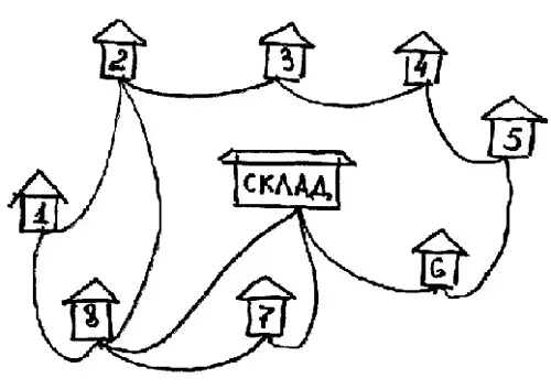 Василий Васильевич работает водителем. Каждый день он берет товар на складе и развозит по магазинам. На рисунке указаны все дороги, по которым он проезжал. Причём, как оказалось, ни по одной из них он не проезжал дважды. Каков был маршрут Василия Васильевича? Какой магазин он посетил последним?