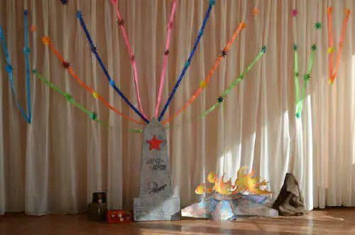 Снова звучит песня "День Победы", дети проходят за ведущим ребенком по залу, возле центральной стены у вечного огня возлагают цветы, затем садятся на стульчики.