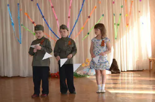 Ведущая. Наша армия разгромила фашистов, освободила родную землю и другие земли. Во время боя, в Берлине, два наших солдата сумели взобраться на крышу Рейхстага и установили там красное знамя. Это означало победу нашей страны в Великой Отечественной войне.
