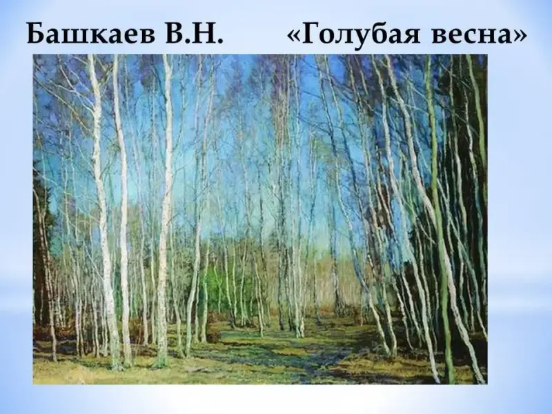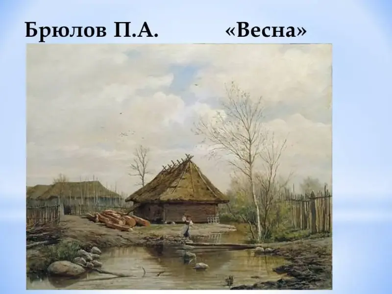 На картине А.К. Саврасова "Грачи прилетели" мы видим уголок русской деревни с небольшой церквушкой, деревянным домом, нераспустившимися берёзами. Пейзаж изображает серую грязноватую весну. Снег едва начал таять, образуя тёмные лужи. Но "обещание" весны сквозит в каждой детали картины.