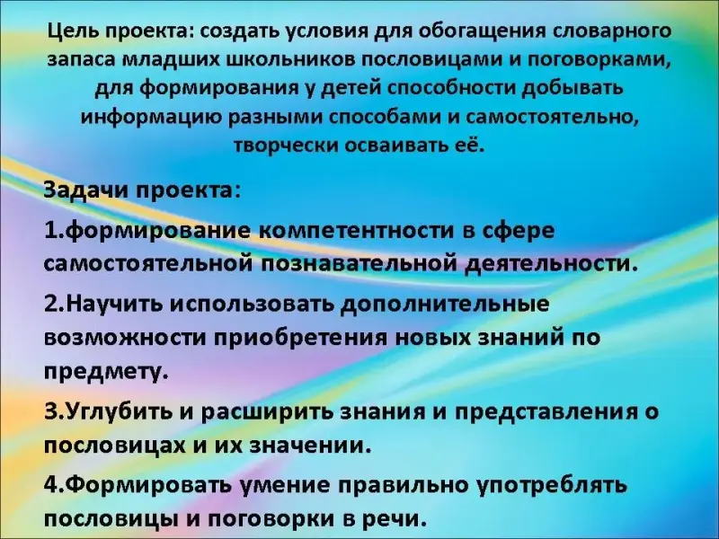 Цель: создать условия для обогащения словарного запаса младших школьников пословицами и поговорками, для формирования у детей способности добывать информацию разными способами и самостоятельно, творчески осваивать её.