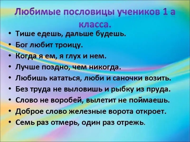 Запомните, друзья, что пословицы и поговорки - это мудрый совет, тонкая мысль, доброе пожелание. Вовремя сказанные, они запоминаются на всю жизнь.