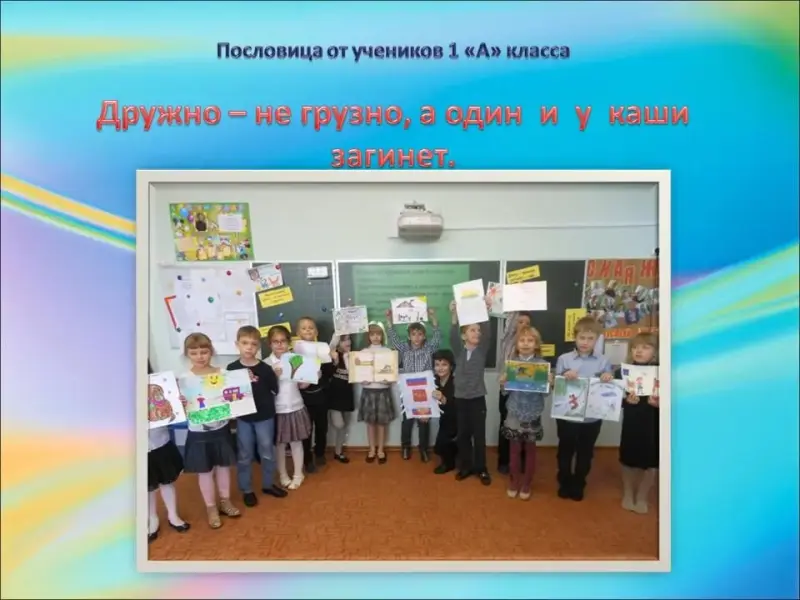 Учащиеся 1"А" класса не только показали свои знания, но и проявили чувство дружбы, умение работать в коллективе. И вот какая русская пословица гласит об этом. "Дружно - не грузно, а один и у каши загинет."