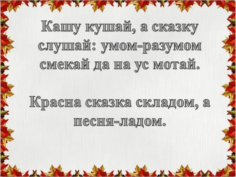 - Кашу кушай, а сказку слушай: умом-разумом смекай да на ус мотай.