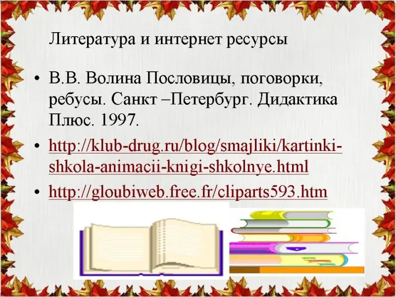 1. Введенская Л.А. Пословицы и поговорки в начальной школе. - Ростов н/Д: Феникс, 2011.