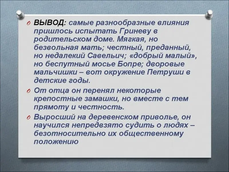Итак, Гринев, выросший на деревенском приволье, вдалеке от губительных нравов светского общества научился непредвзято судить о людях. Он перенял от отца некоторые крепостные замашки, но вместе с тем прямоту и честность.