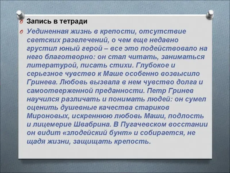 - Обратимся к теме сочинения. Какой из вопросов полнее выражает ее суть: "Какие события произошли с Гриневым в крепости?" или " Как изменили Гринева события, пережитые им в Белогорской крепости?"