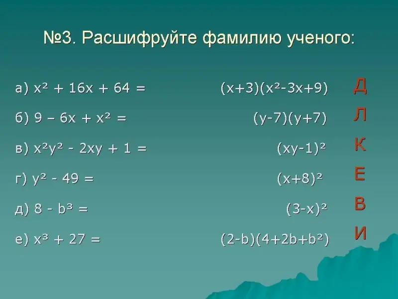 - Познавательные: работа с формулами сокращенного умножения.