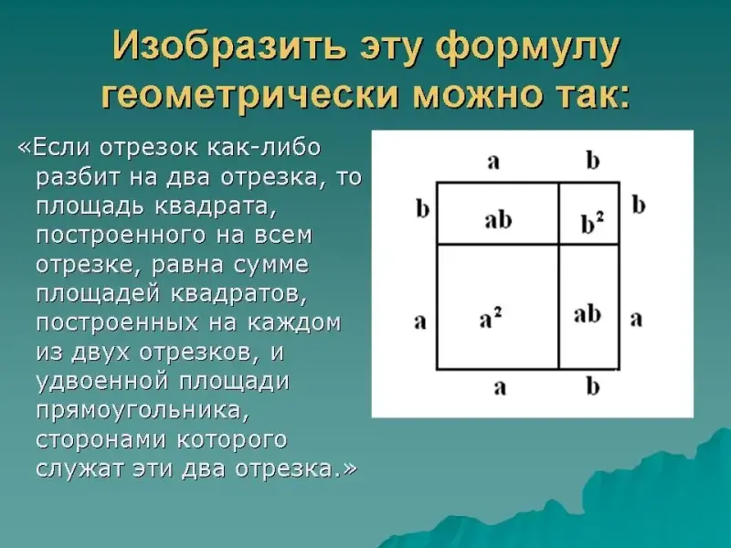 "Если отрезок как-либо разбит на два отрезка, то площадь квадрата, построенного на всем отрезке, равна сумме площадей квадратов, построенных на каждом из двух отрезков, и удвоенной площади прямоугольника, сторонами которого служат эти два отрезка"