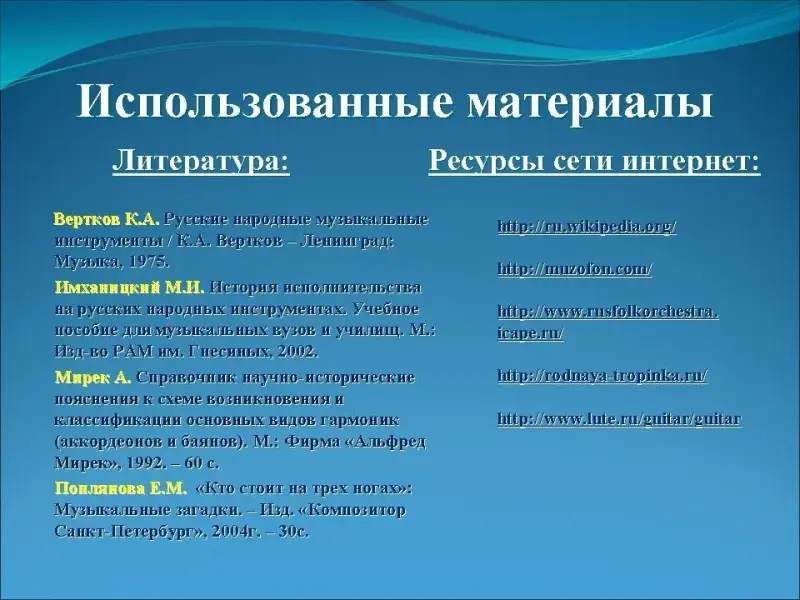 - Вертков К.А. Русские народные музыкальные инструменты / К.А. Вертков - Ленинград: Музыка, 1975.