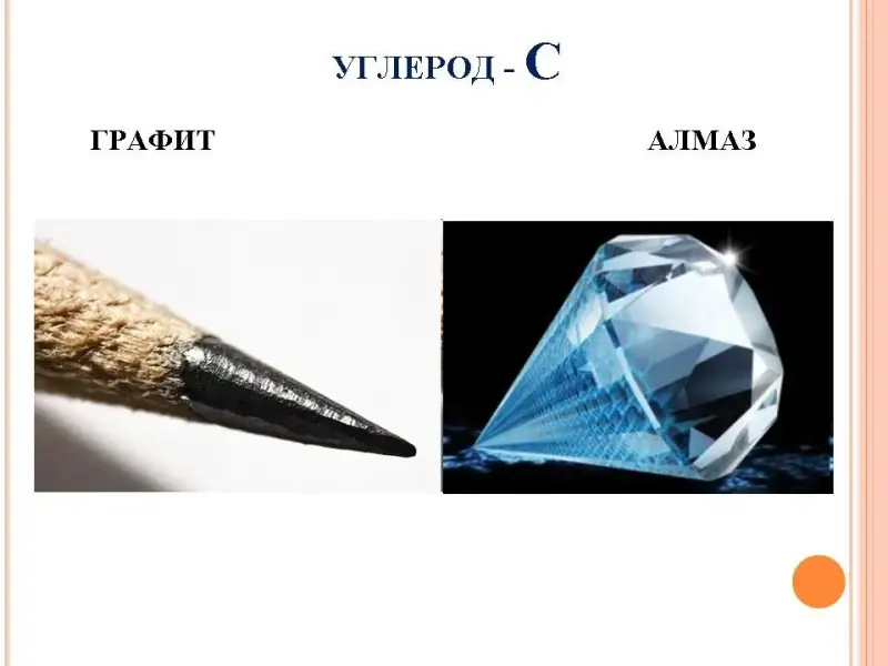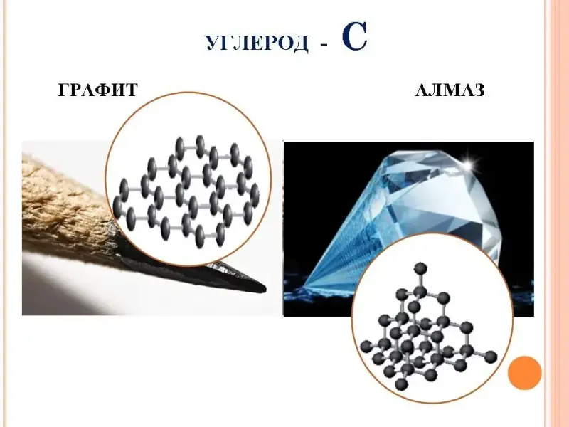 Все мы знаем, что вода может быть и жидкой (это её естественное состояние), и твердой - лёд (при температуре ниже 0°С), и газообразной - водяной пар (слайд № 1). Отличаются ли свойства воды, льда и водяного пара? Может кто-то и затрудняется ответить. Поэтому, рассмотрим ещё один пример: алмаз и графит, два тела состоящие их углерода (слайд № 2). Отличаются ли их свойства? Конечно, графит легко расслаивается - грифель карандаша тому подтверждение, алмаз - один из самых твердых пород. Чем можно объяснить такую разницу?