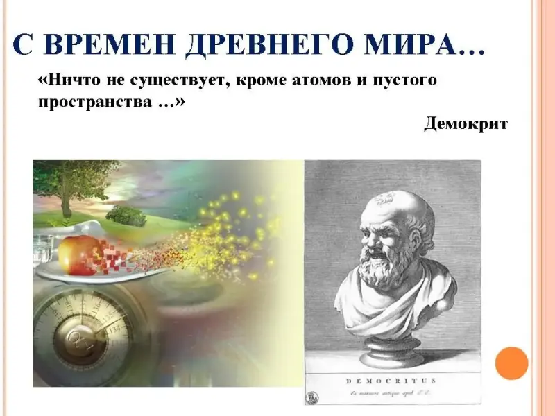 Вы не поверите, но вопросами внутреннего "устройства" тел задавалось человечество ещё в древние времена. Легенда гласит, что в Древней Греции в IV-V веках до н.э. ученый Демокрит (слайд № 4), держа в руке яблоко, задумался: сколько раз можно яблоко разрезать на части? (Действенные генеративные вопросы)