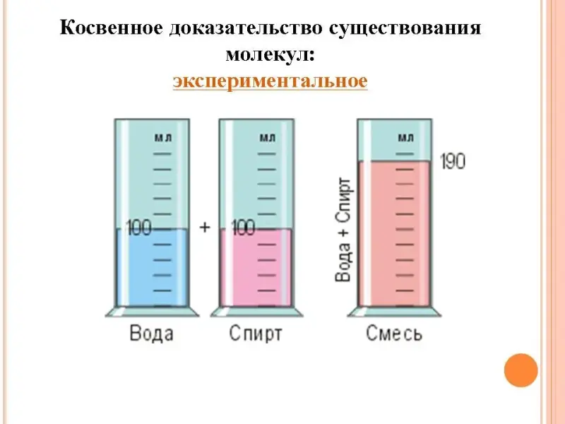 Молодцы! Мир молекул уникален и удивителен. Вот еще один опыт (слайд № 7). В одну мензурку нальём 100 мл воды, а в другую - 100 мл подкрашенного спирта. Перельём жидкости из этих мензурок в третью (см. рисунок). Удивительно, но объём смеси получится не 200 мл, а меньше: 190 мл. Однако при этом масса смеси в точности равна сумме масс воды и спирта. /В опыте спирт можно заменить сахаром-рафинадом/